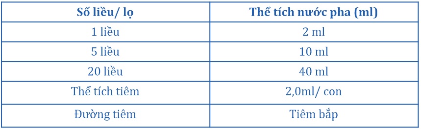 Lọ: 1 liều, 5 liều và 20 liều (có kèm nước pha 2ml, 10ml, 40ml) tương ứng