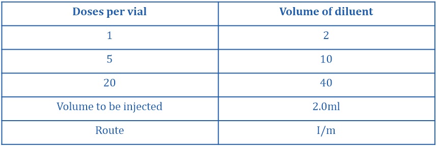 - Vials of vaccine containing 1, 5, 20 doses with diluent liquid in bottle of 1, 10, 40ml