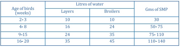 For drinking water administration (use for layers and broilers): Reconstitute the vaccine as described earlier. Pour the reconstituted vaccine into another clean vessel containing approximately 4 liters. Mix well and distribute according to the table below which also gives the quantity of skim milk powder (SMP) to be added for stabilization of vaccine during administration.