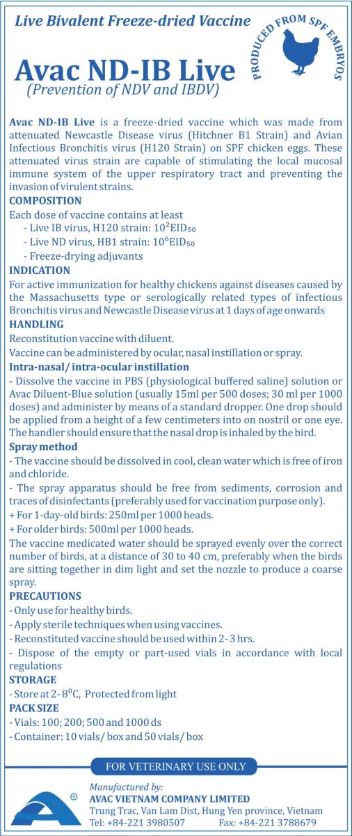 Avac ND-IB Live is a freezw-dried vaccine which was made from attenuated Newcastle Disease virus ( Hitchner B1 Strain ) and Avian infectious Bronchitis virus (H120 Strain) on SPF chiken eggs.