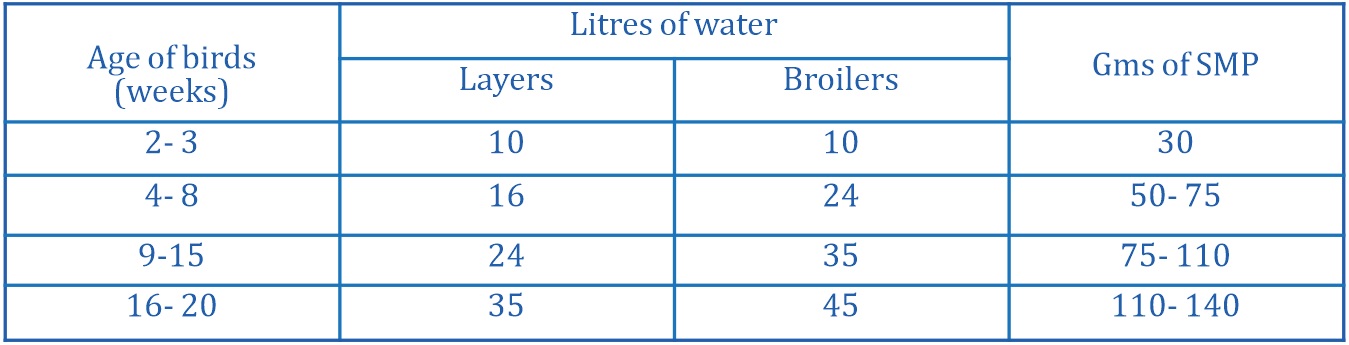 For drinking water administration: Reconstitute the vaccine as described earlier. Pour the reconstituted vaccine into another clean vessel containing approximately 4 liters. Mix well and distribute according to the table below which also gives the quantity of skim milk powder (SMP) to be added for stabilization of vaccine during administration.