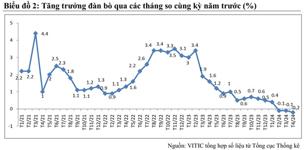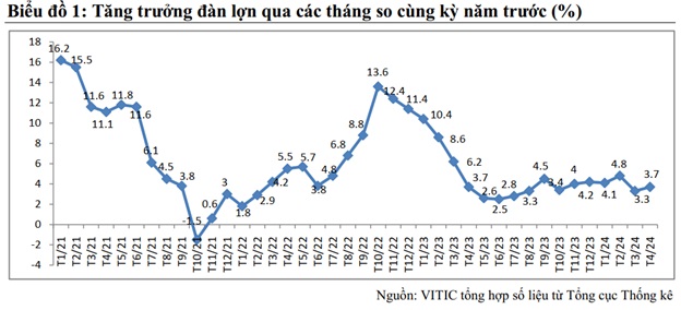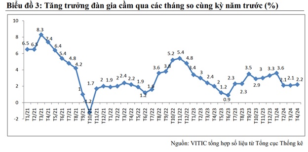 Trong tháng 4/2024, chăn nuôi trâu, bò không có biến động lớn, đàn trâu tiếp tục xu hướng giảm do diện tích chăn thả thu hẹp, hiệu quả kinh tế không cao. Đàn lợn và đàn gia cầm cầm phát triển tốt do thị trường tiêu thụ và giá cả đầu ra ổn định