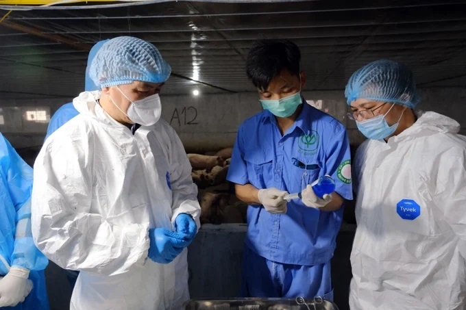 Tiêm vacxin Dịch tả lợn châu Phi tại một cơ sở chăn nuôi ngoại thành Hà Nội. Ảnh: Bảo Thắng.