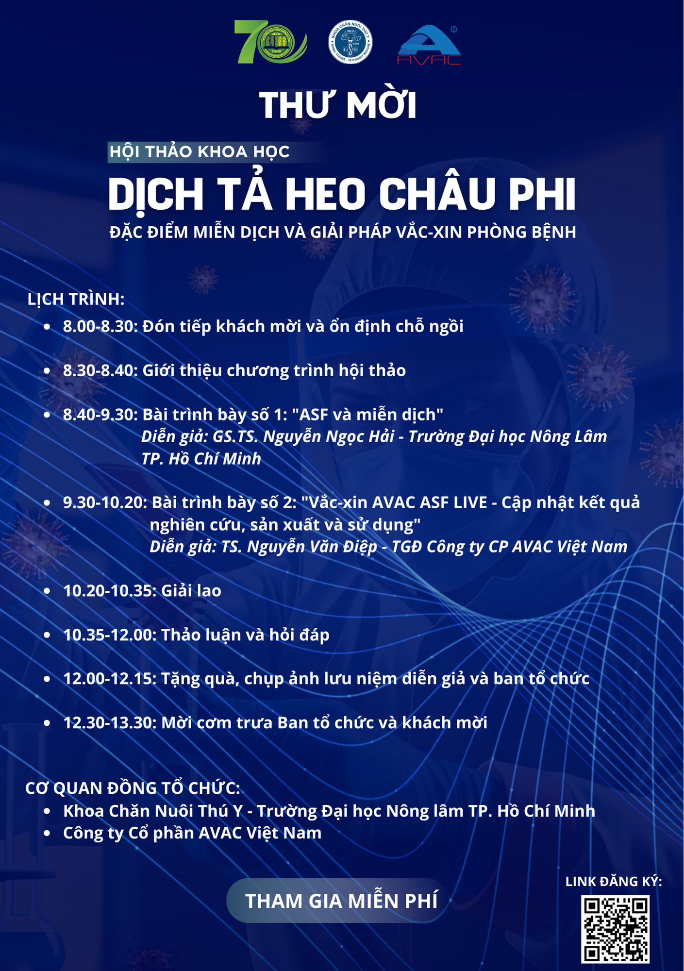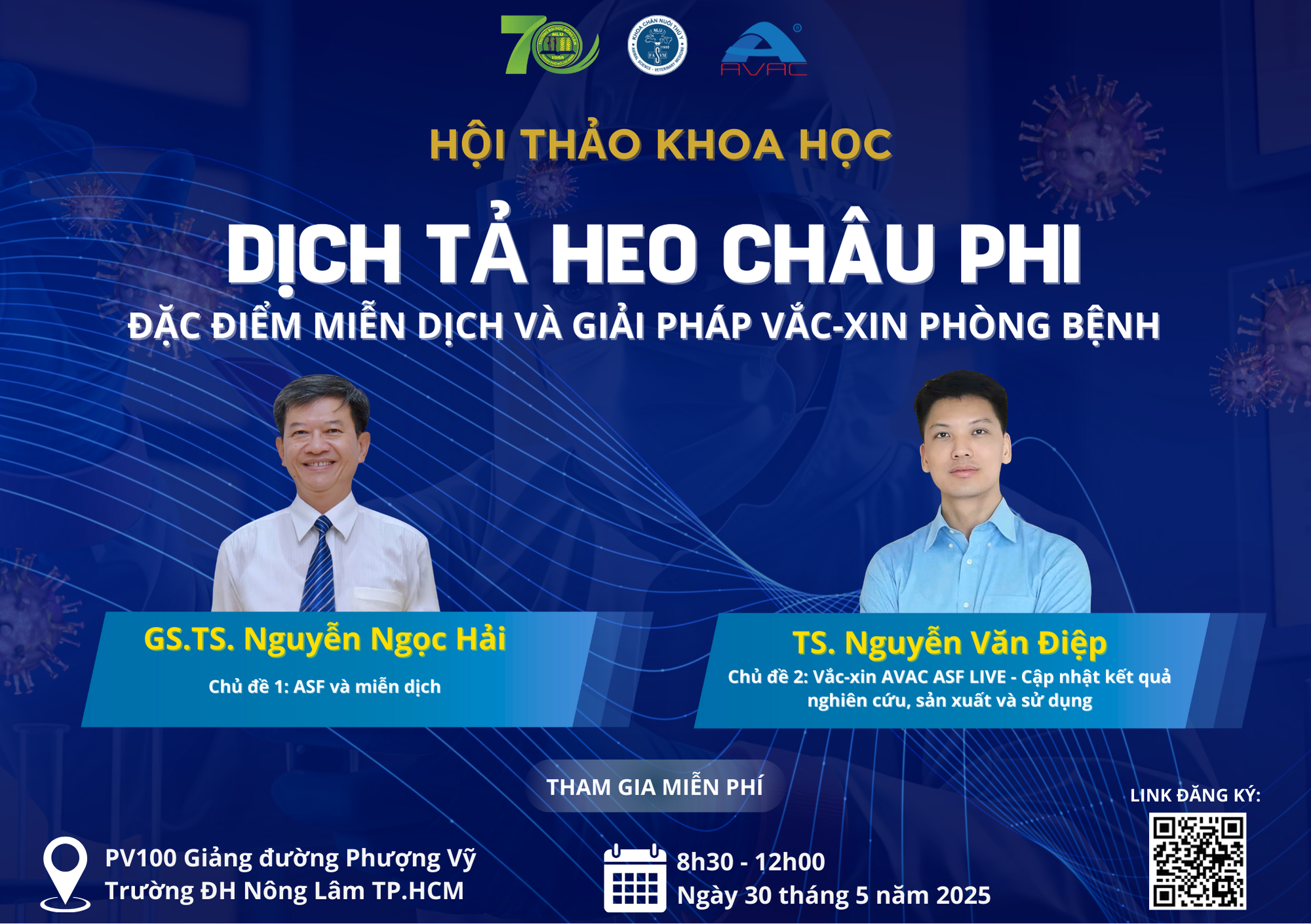 Trân trọng kính mời Quý Thầy Cô, quý chuyên gia, doanh nghiệp, nhà chăn nuôi và các bạn sinh viên ngành thú y tham dự hội thảo khoa học chuyên sâu cùng hai diễn giả: GS.TS Nguyễn Ngọc Hải và TS Nguyễn Văn Điệp