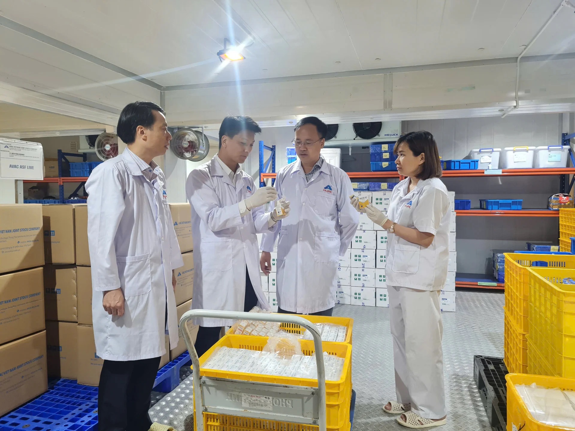 Ông Phan Quang Minh (thứ hai từ phải sang), Phó Cục trưởng Cục Chăn nuôi và Thú y (Bộ Nông nghiệp và Môi trường) cùng lãnh đạo Công ty CP AVAC Việt Nam kiểm tra lô hàng vaccine trước khi xuất khẩu sang Indonesia.