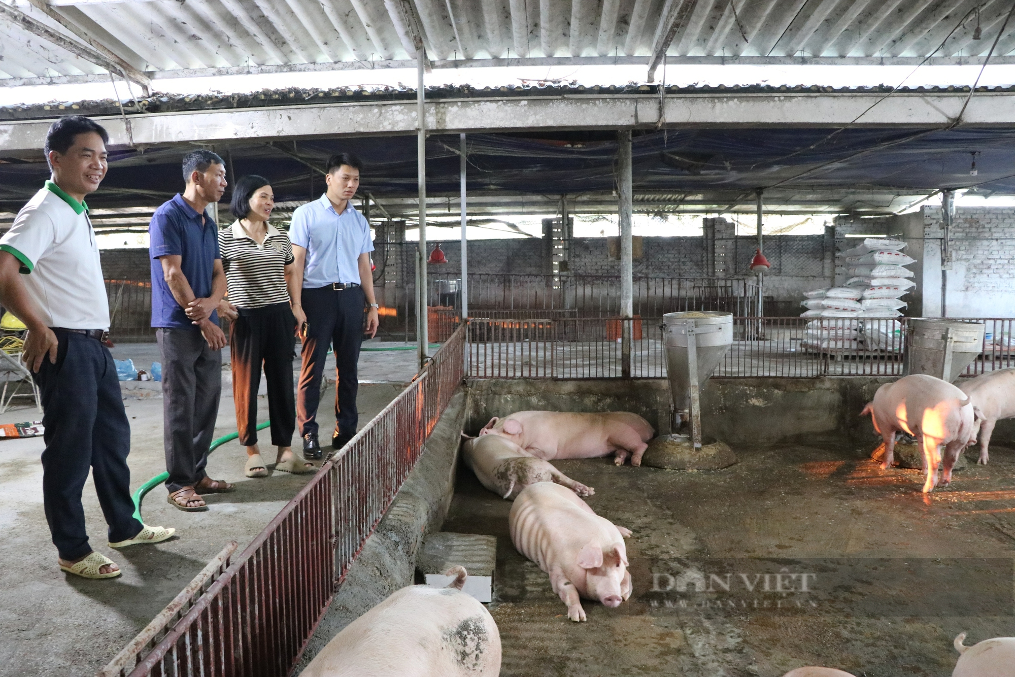 Tổng Giám đốc Công ty Cổ phần AVAC Việt Nam Nguyễn Văn Điệp (ngoài cùng bên phải) cùng các hộ chăn nuôi trên địa bàn huyện Vĩnh Tường (Vĩnh Phúc) tham quan trang trại lợn của chị Oanh khi đã tiêm vaccine ASF. Ảnh: Minh Ngọc