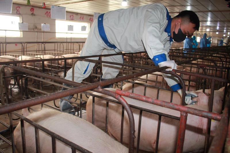 Tiêm vaccine AVAC ASF Live mũi thứ 2 cho 270 lợn nái tại trang trại ở xã Tân Tiến, huyện Văn Giang, tỉnh Hưng Yên. Ảnh Chu Khôi