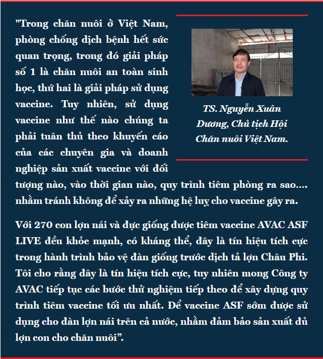 “AVAC hiện đã phối hợp với Trung tâm Kiểm nghiệm Thuốc Thú y Trung ương I để xây dựng và hoàn thiện bộ tiêu chí đánh giá vaccine ASF trên lợn giống. Trong thời gian tới, Công ty sẽ đề xuất Cục Thú y (Bộ Nông nghiệp và Môi trường) tiến hành kiểm nghiệm, khảo nghiệm chính thức vaccine AVAC ASF LIVE trên đối tượng lợn giống. Quy trình đánh giá này dự kiến kéo dài khoảng 5 - 6 tháng".